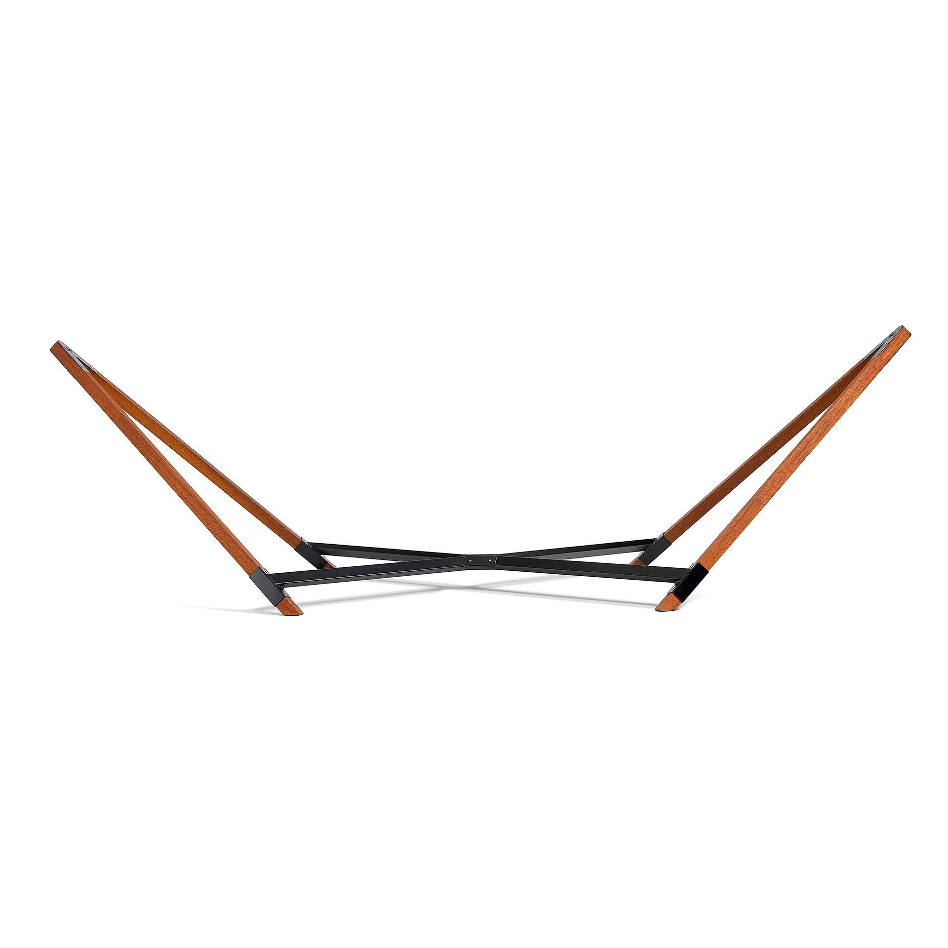 Our Taj Collection hammock stands diverge from the sleek curves of our original hammock stand, focusing on geometric lines, combining powder-coated aluminum and kwila hardwood for a modern aesthetic.